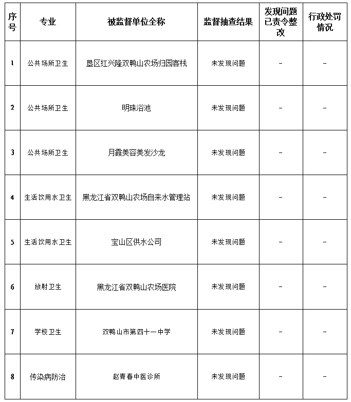 根据《关于印发2025年黑龙江省随机监督抽查的通知》(黑疾控监督函〔2025〕9号)的要求,现将宝山区卫生健康局2025年国家随机监督抽查结果信息进行公示。