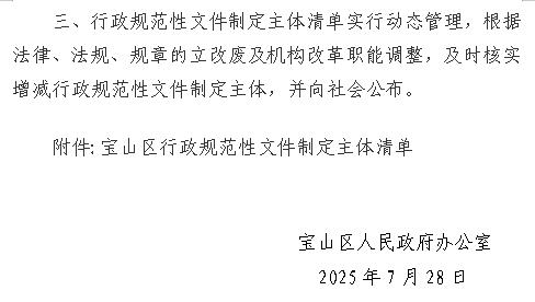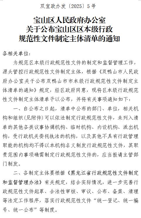 双宝政办发〔2025〕5号 宝山区人民政府办公室关于公布宝山区区本级行政规范性文件制定主体清单的通知